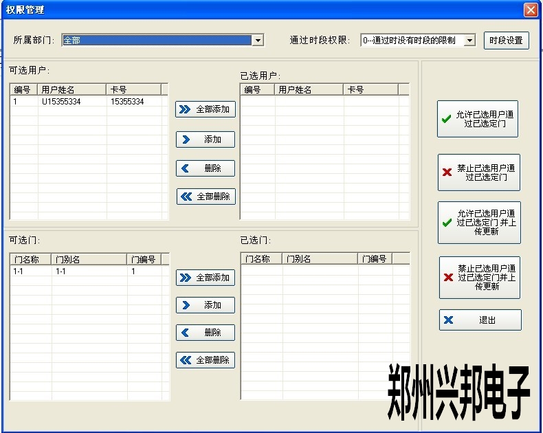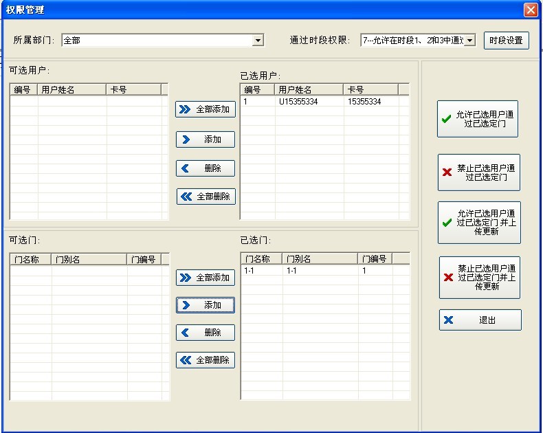 4、上傳完成后關閉窗口,在‘通過時間段權限’中選擇需要的時間段然后將用戶和控制器都添加進去,最后點擊‘允許已選用戶通過已選定門并上傳更新’上傳權限。如下圖所示