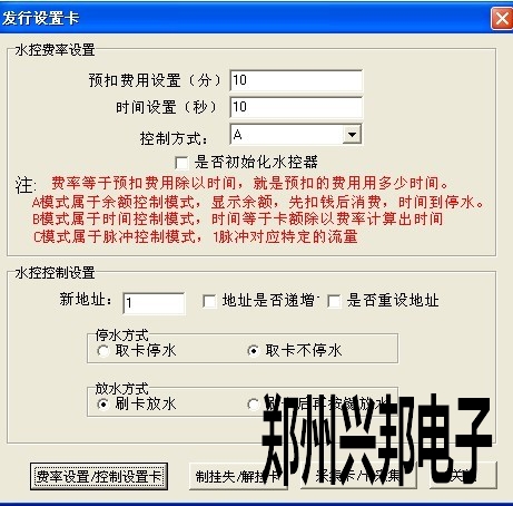 3. 水控控制設置可以更改水控機的機器號還有流水方式和停水方式;如果想更改水控機的機器號必須選擇是否重設地址;地址是否遞增,當勾選上時,機器每刷一次控制卡機器號就會增1;根據(jù)所需設置好后,點擊費率設置/控制設置卡,選擇控制設置卡即可;只更改流水/停水方式時,在機器上刷控制卡時顯示9 10 ok,如果更改機器號,刷控制卡時顯示8 9 10 ok。