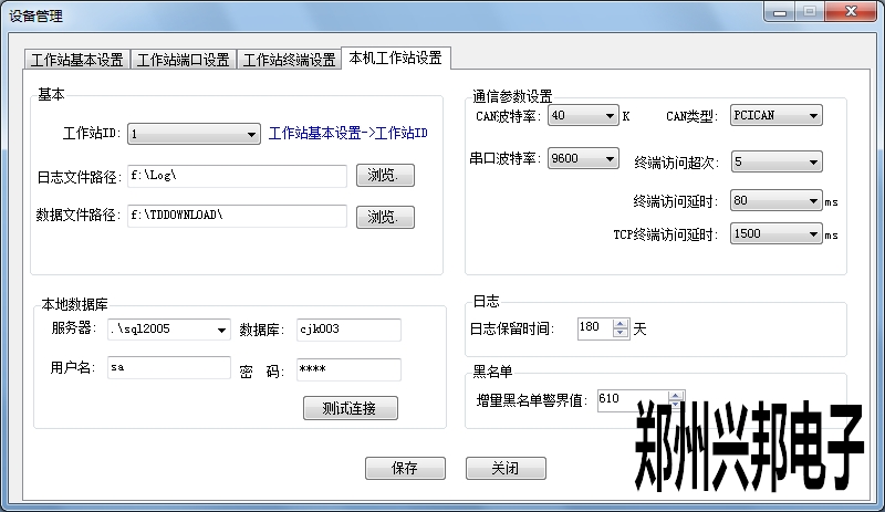 本機工作站設置:工作站ID即選擇工作站基本設置中添加工作站的ID號,下面選擇存放日志文件和數據文件的地址;通訊參數設置中CAN波特率默認為40K,串口波特率默認為9600,此處設置不對會導致機器不通訊。終端訪問超次從1到100,默認為5,終端訪問延時從10ms到6000ms,默認為20ms,此處設置會影響監控平臺下載參數和上傳記錄的速度,一般使用默認值;本地數據庫設置中服務器選擇數據庫2005的服務器名,數據庫填寫創建采集庫的數據庫名稱,用戶名sa,密碼為hnzz,設置后點擊測試連接,看能否連通;日志保留時間和增量黑名單警界值可以自主更改。