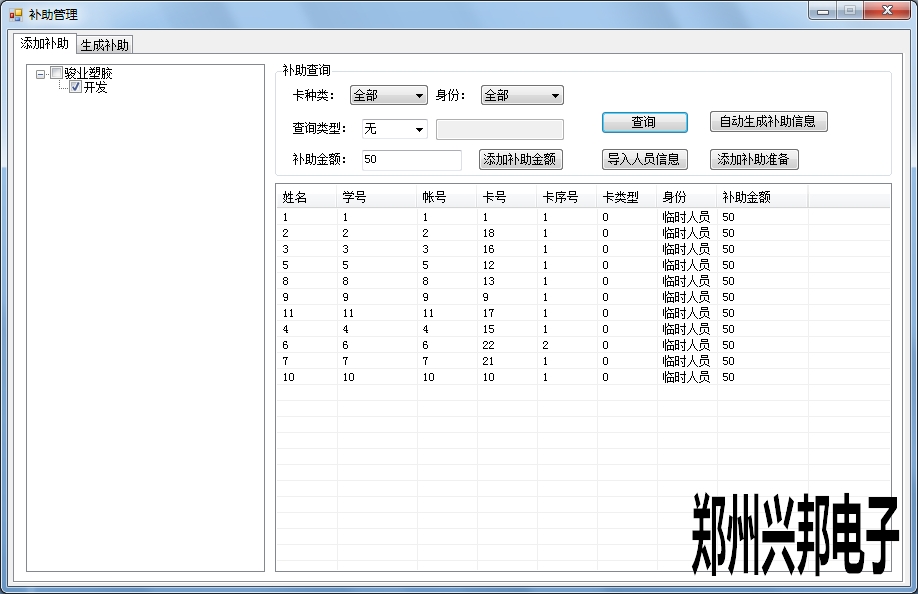 一卡通綜合管理系統發放補助的功能是可以生成企業補助錢包,定期發放補助、補助清零。在補助管理中進行添加補助和生成補助。首先進行添加補助,勾選左側欄部門,可以選擇限定條件卡類型和身份以及查詢類型(學號、姓名、卡號)進行查詢需要添加補助的人員信息,填寫補助金額,對所選人員添加補助金額,然后添加補助準備,即可以在生成補助中看到。其中自動生成補助信息是對查詢到的人員進行默認為0的補助金額,然后可以添加補助準備。