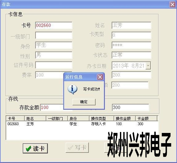 正常的情況是將卡放在讀卡器上,點擊【讀卡】出現卡信息,在存款金額右邊的文本框中輸入存款金額,然后點擊【寫卡】,提示寫卡成功后點擊【確定】按鈕即可。存錢后最大卡金額不能超過9999.99